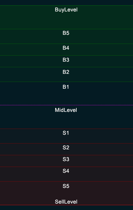 This indicator automatically computes 5 supplementary Buy (B1-B5) and Sell (S1-S5) Levels. While enhancing visual appeal, these extra levels offer strategic advantages within our Strategy Builder. Refer to the accompanying image on the right, which denotes the series name for each level. This chart serves as a guide while constructing your strategies. These levels are derived from Fibonacci levels between the MidLevel and Buy/Sell Levels.