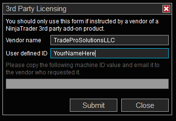I use the 3rd Party Licensing model. First you’ll need to open the 3rd Party Licensing dialog box located Help > 3rd Party Licensing…Vendor name: TradeProSolutionsLLC